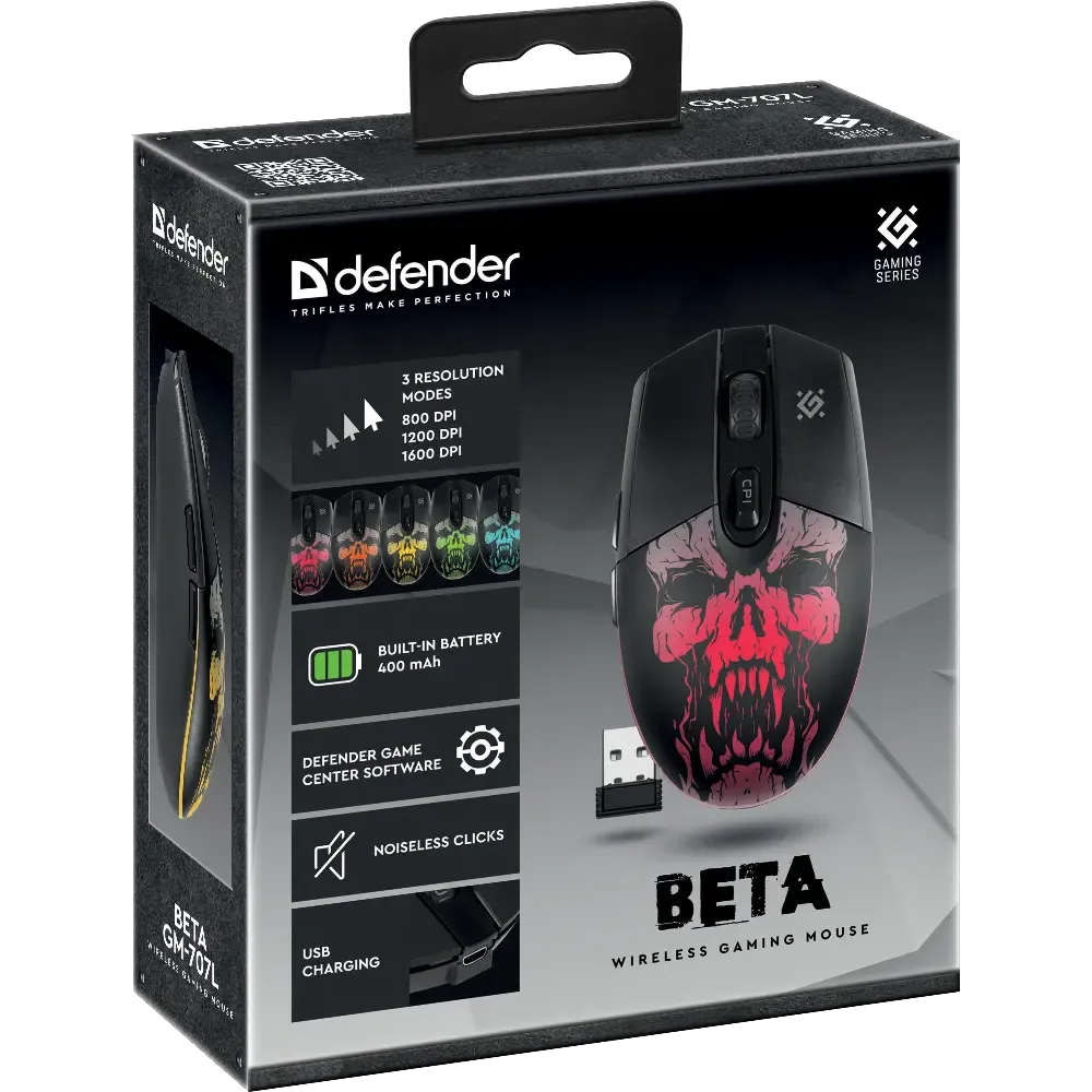Беспроводная игровая мышь BETA GM-707L - эргономичный корпус, бесшумный клик и переливающаяся подсветка. Встроенный аккумулятор емкостью 400 мАч. Работа датчика в режимах от 800 dpi до 1600 dpi позволяет настроить максимально удобный по скорости отклик на команды, что особенно важно в компьютерных играх.