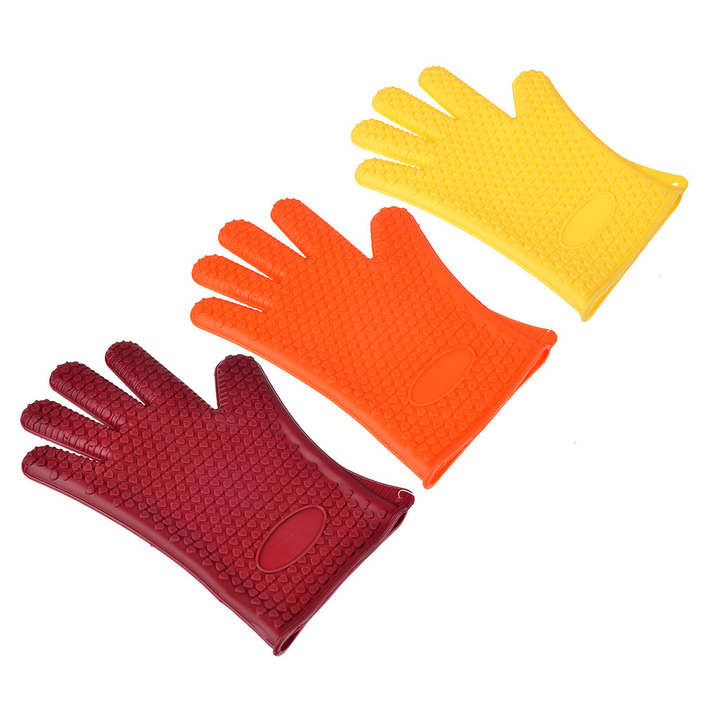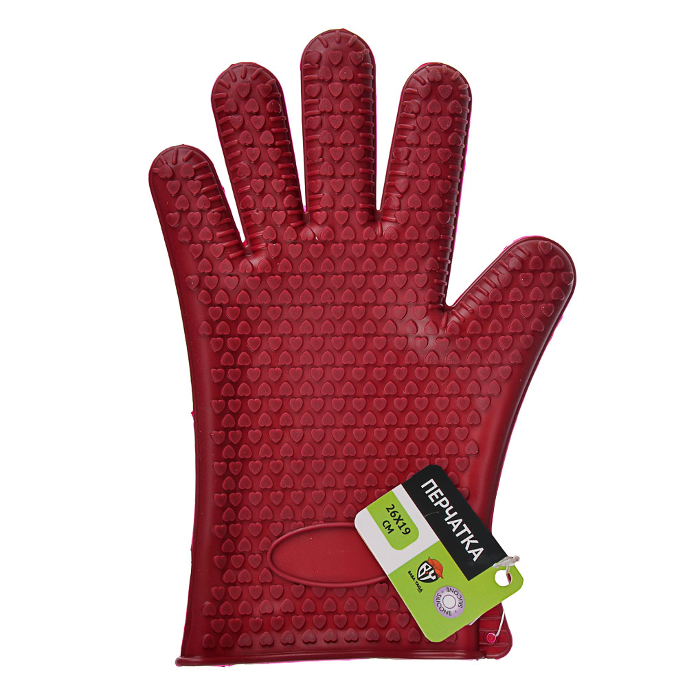 Прихватка в форме перчатки из силикона с рифленой поверхностью, препятствующей скольжению.