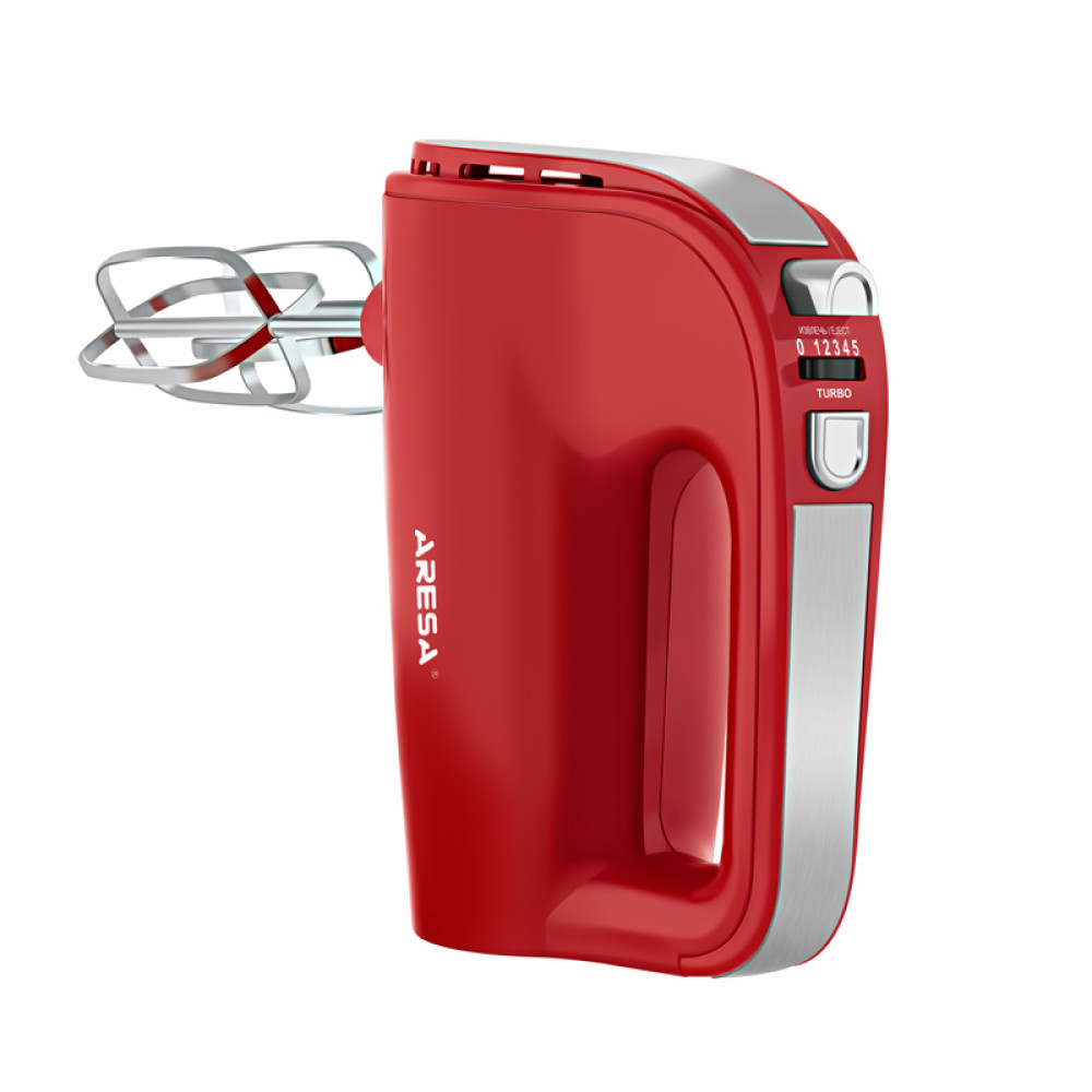 ARESA AR-1906 обладает 5 скоростными режимами, для регулировки которых на ручке прибора предусмотрен переключатель режимов. Такое расположение переключателя позволит удобно пользоваться миксером, быстро переключая режимы его работы. В режиме "Турбо" происходит максимальное увеличение скорости: включить этот режим можно будет при помощи специальной кнопки. Миксер использует для взбивания два венчика, а также предусматривает в комплекте два крюка, с которыми легко будет замесить тесто.