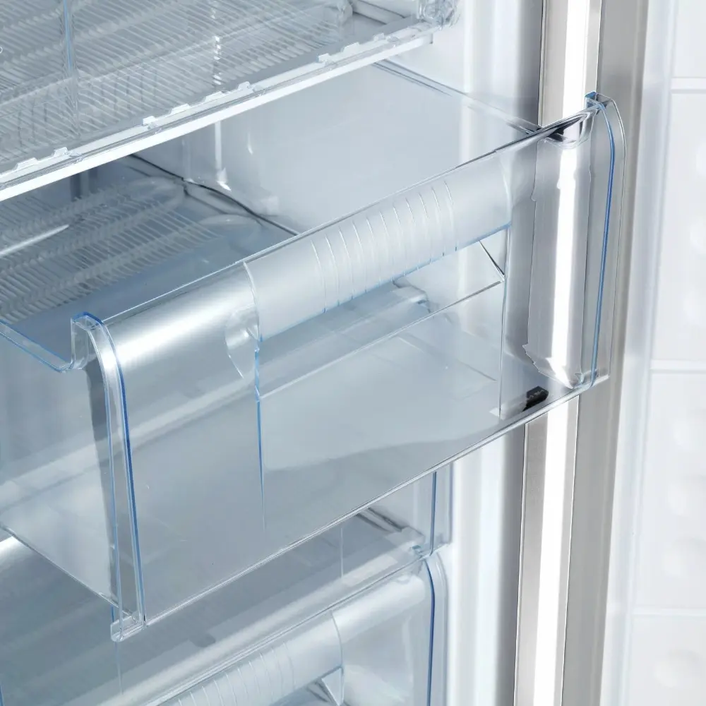 Оборудован перенавешиваемой дверью, выполненной из пластика и металла. Механизм мягкого закрывания предотвращает резкое и громкое захлопывание. Для открытия используется скрытая ручка. Стенки камеры легко очищаются от загрязнений. Температура регулируется с помощью термостата. В прибор заложена функция быстрой заморозки.