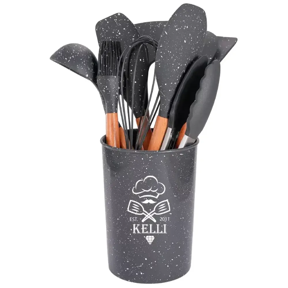 Набор кухонных принадлежностей KELLI KL-01123 в подставке для хранения - идеальный аксессуар на любой кухне и отличный подарок каждой хозяйке. В набор входит 10 предметов из бамбука и силикона, а также подставка из пластика.