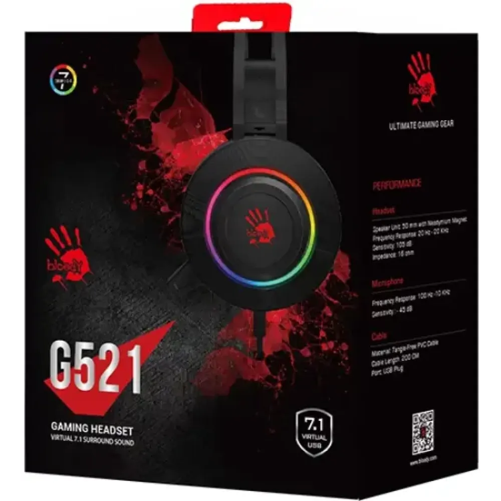 Гарнитура A4 Bloody G521 черный 2.3м полноразмерная компьютерная гарнитура прекрасно подойдет для любимых активных игр, а также просмотра видеоконтента. Объемный качественный звук в формате 7.1 позволяет испытать полное погружение в процесс и улавливать мельчайшие детали. Удобное саморегулируемое оголовье сразу подстраивается под форму и размеры головы, что позволяет пользоваться аксессуаром длительное время. Подключение к устройствам осуществляется при помощи провода длиной 2,3 м в специальной оплетке, что обеспечивает его долговечность.