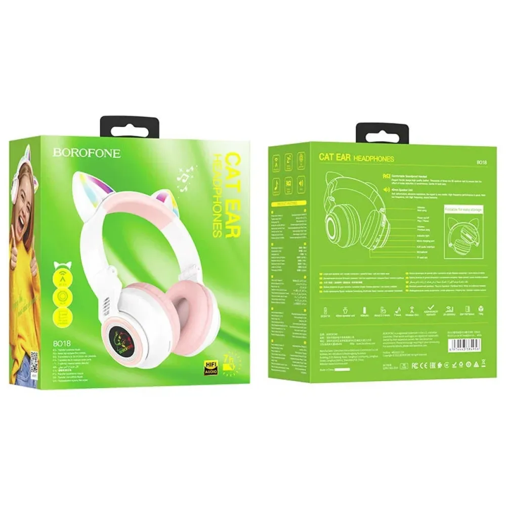 Гарнитура Bluetooth Borofone BO18 выделяется среди остальных аналогичных моделей неординарной конфигурацией. Их оголовье украшено кошачьими ушками. В модели сочетаются достоинства классических полноразмерных наушников и необычные световые эффекты. Амбушюры полностью закрывают уши, отсекая назойливый шум окружающего мира. В игриво торчащие уши интегрированы светодиоды, которые ярко переливаются.