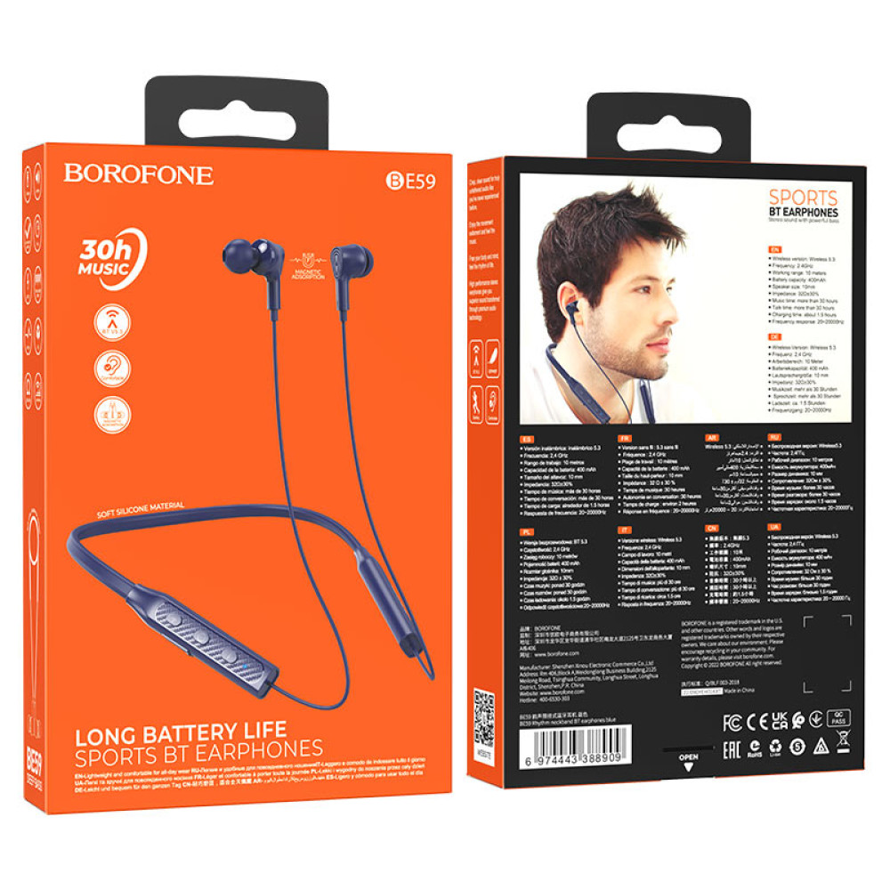 Гарнитура Bluetooth Borofone BE59 работает в диапазоне 10 м от источника подключения, полного заряда хватает на 30 часов, в режиме ожидания до 200 часов. Удобное управление громкостью, треками и звонками.