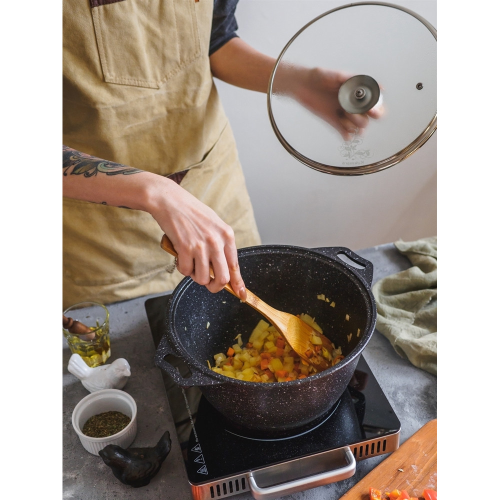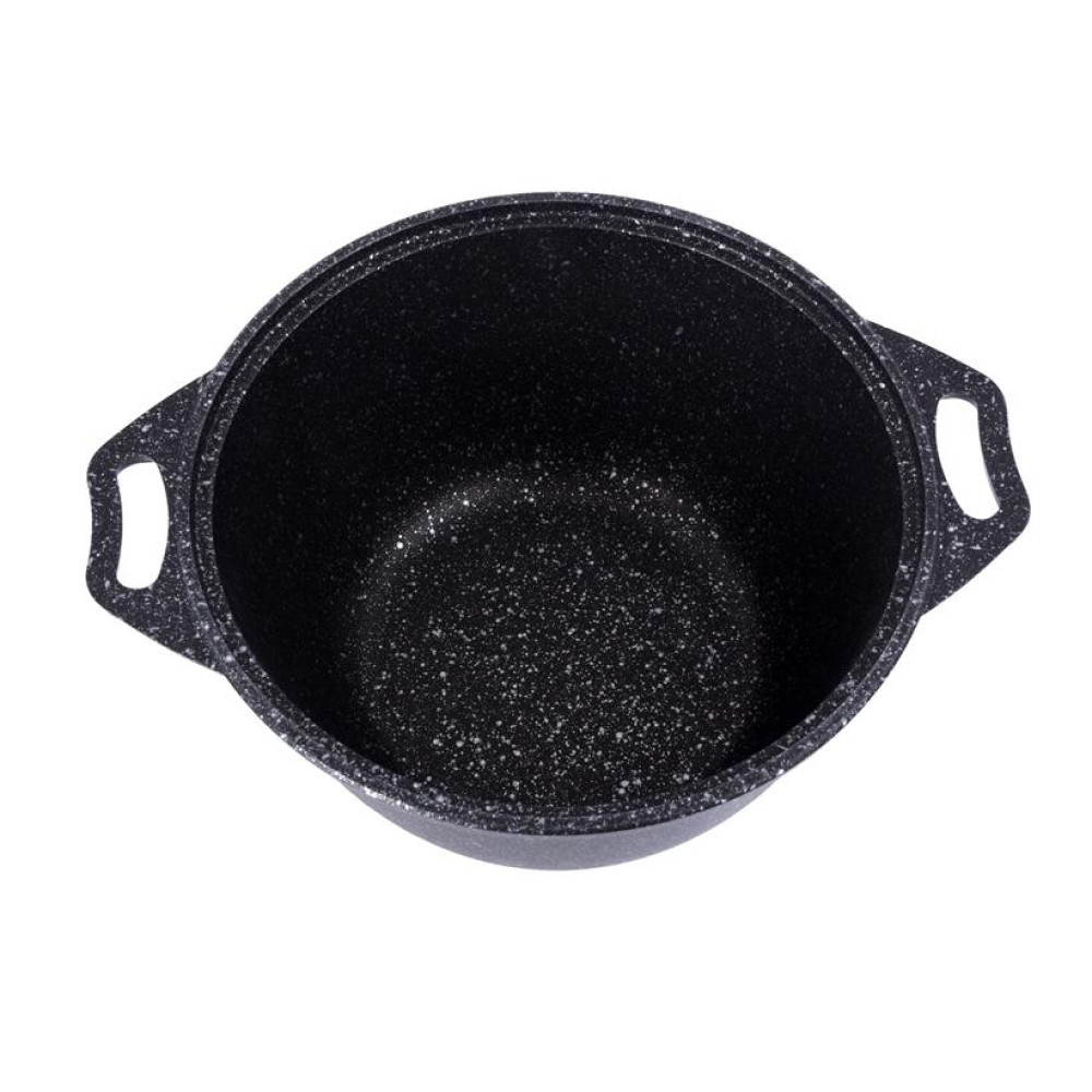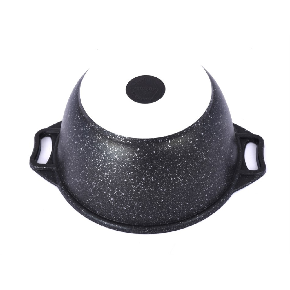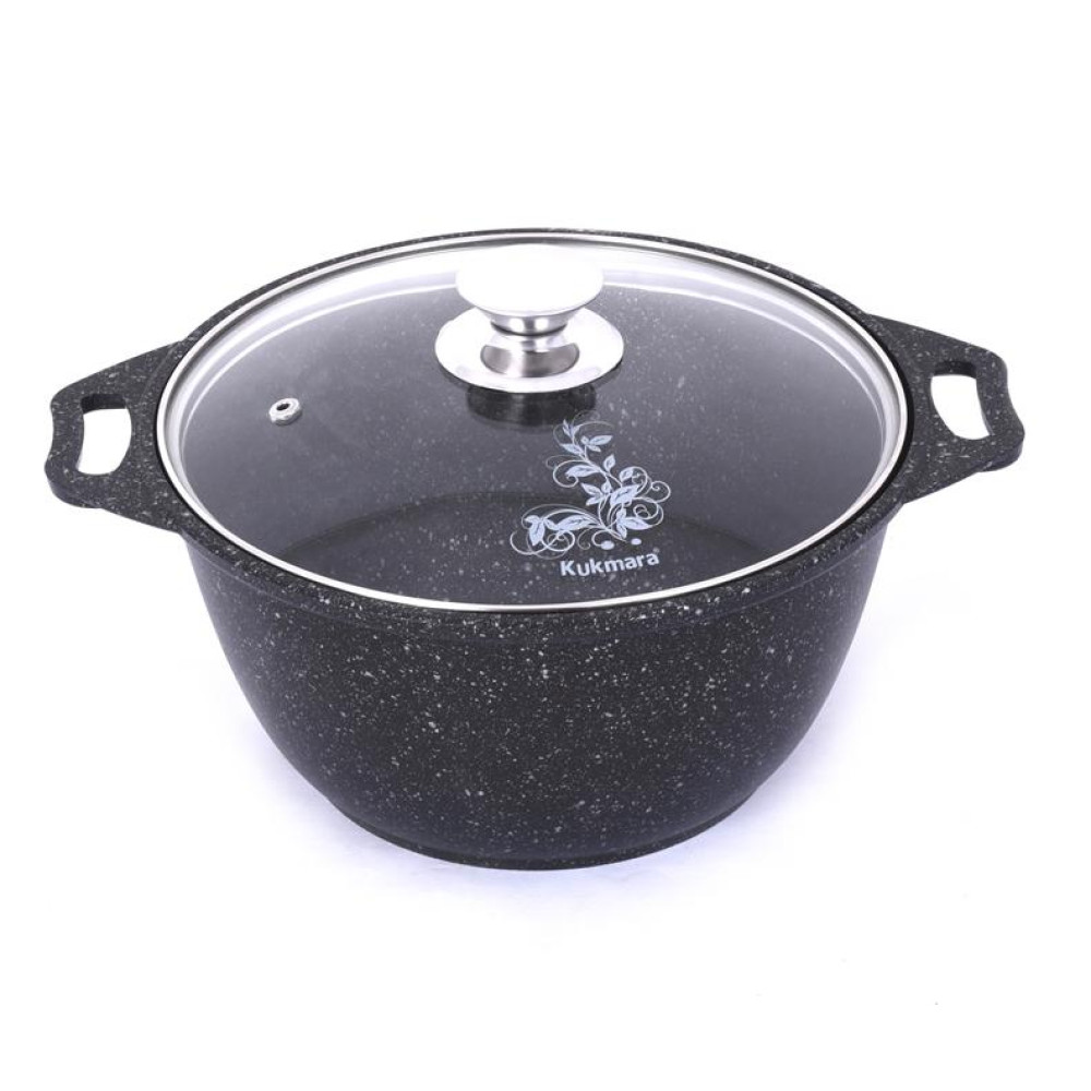Кастрюля "Kukmara" изготовлена из литого алюминия и покрыта инновационным антипригарным мраморным покрытием нового поколения на водной основе, усиленным сверхтвердыми частицами минералов.