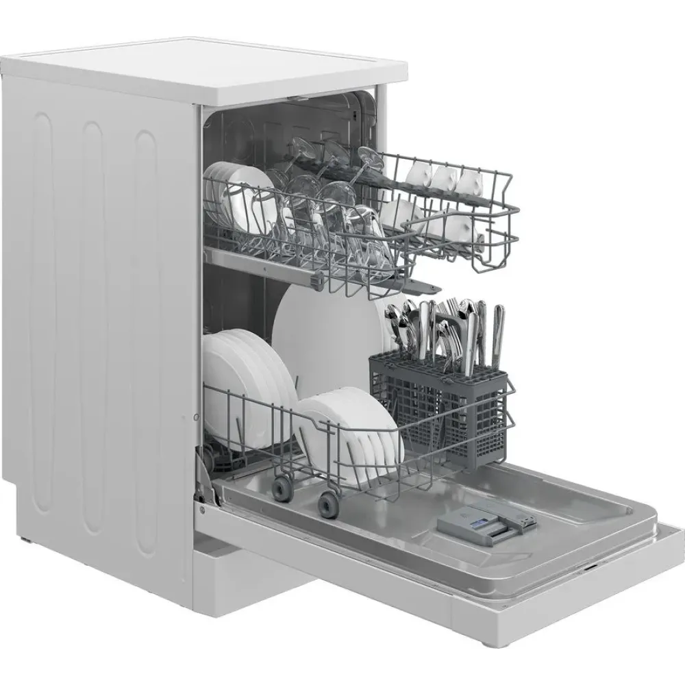 Посудомоечная машина INDESIT DFS 1A59 предназначена для использования в бытовых условиях и может вмещать до десяти комплектов посуды. Уровень шума, сопровождающий работу устройства, не превышает 49 дБ. Это позволяет запускать модель в ночные часы. Реализованный конденсационный тип сушки основан на естественном испарении влаги, что позволяет экономить потребляемую электроэнергию. Модель имеет пять программ мойки, в том числе «Интенсивная», «Быстрая», «Экономичная». Устройство оснащено таймером отсрочки запуска на 9 ч. За счет этого можно задавать время начала цикла. Режим половинной загрузки позволяет активировать цикл мойки при частичном заполнении корзин.
