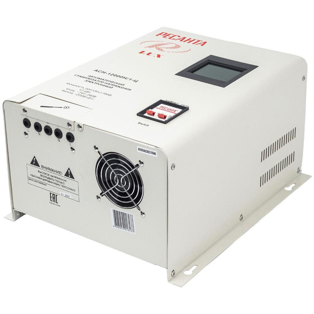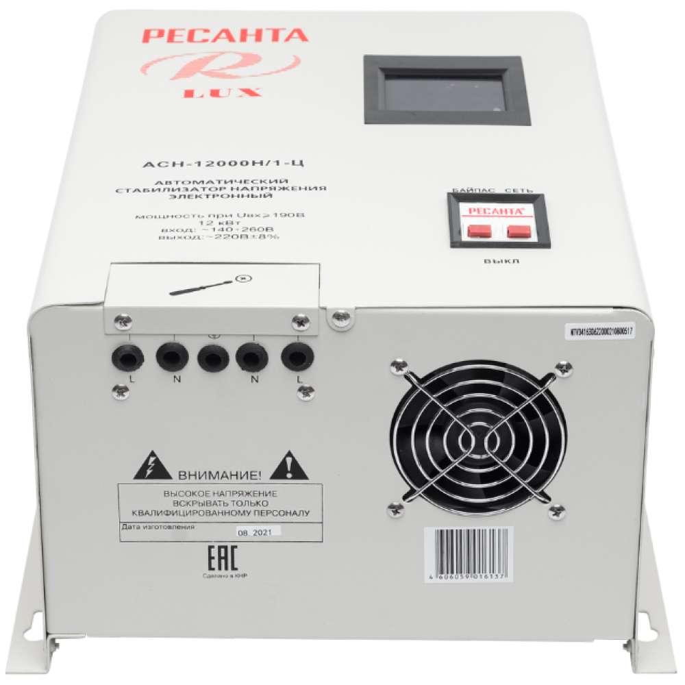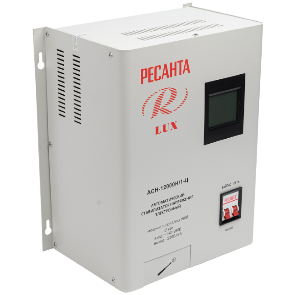 Стабилизатор напряжения серии LUX РЕСАНТА АСН-12000Н/1-Ц релейного типа предназначен для выравнивания входного напряжения и защиты приборов от перепадов напряжения с суммарной мощностью до 12 кВт. Работает с напряжением 220В с точностью до +/-8%.