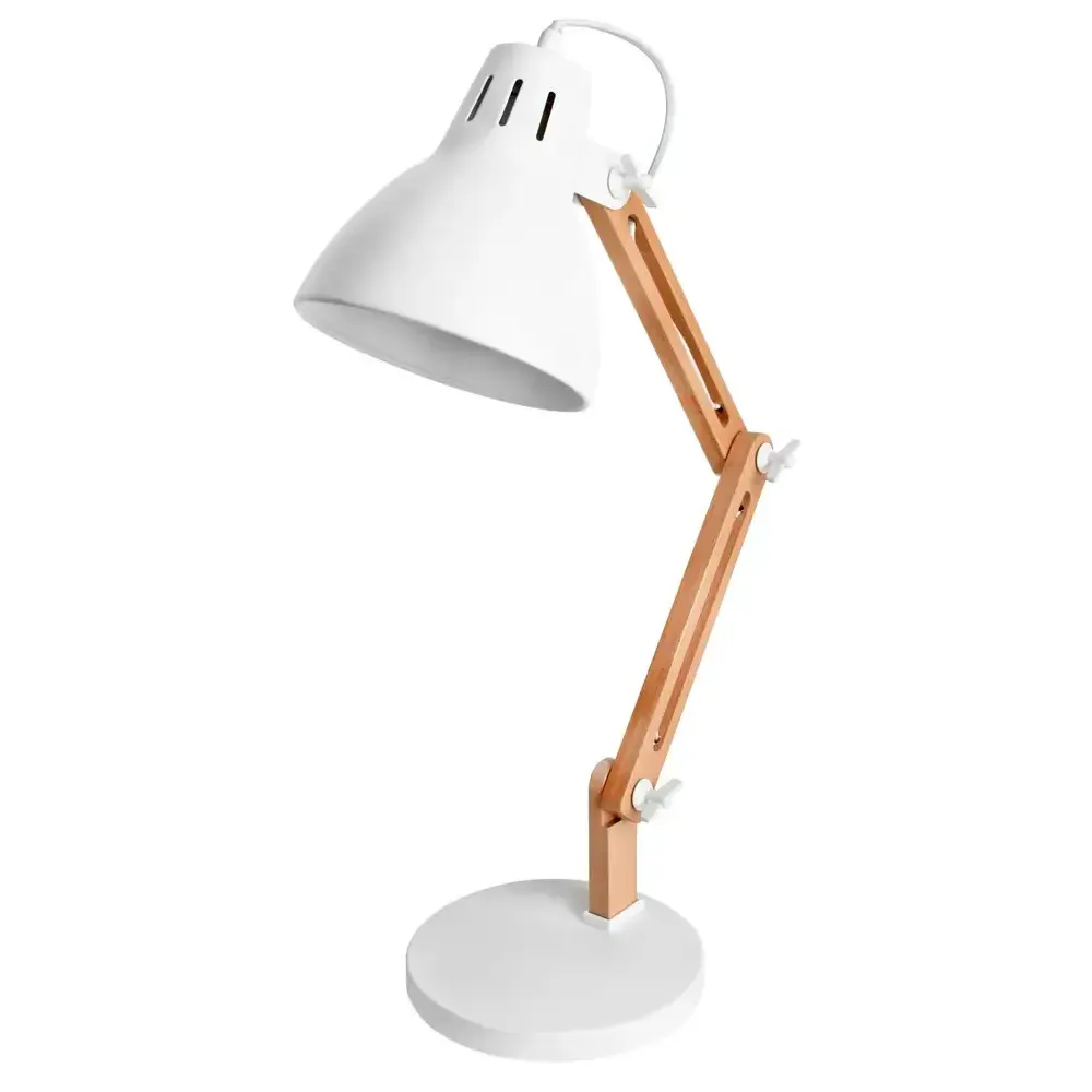 Максимальная потребляемая мощность составляет 40 Вт. Яркое освещение издает всего одна лампа накаливания, ее света достаточно для комфортной работы. Высота светильника составляет 56 см. Деревянный корпус поддается регулировке. Подставка и плафон изготовлены из металла. Длина шнура у этой модели достигает 1,6 м. Этого достаточно для того, чтобы разместить светильник на удобном расстоянии от розетки.