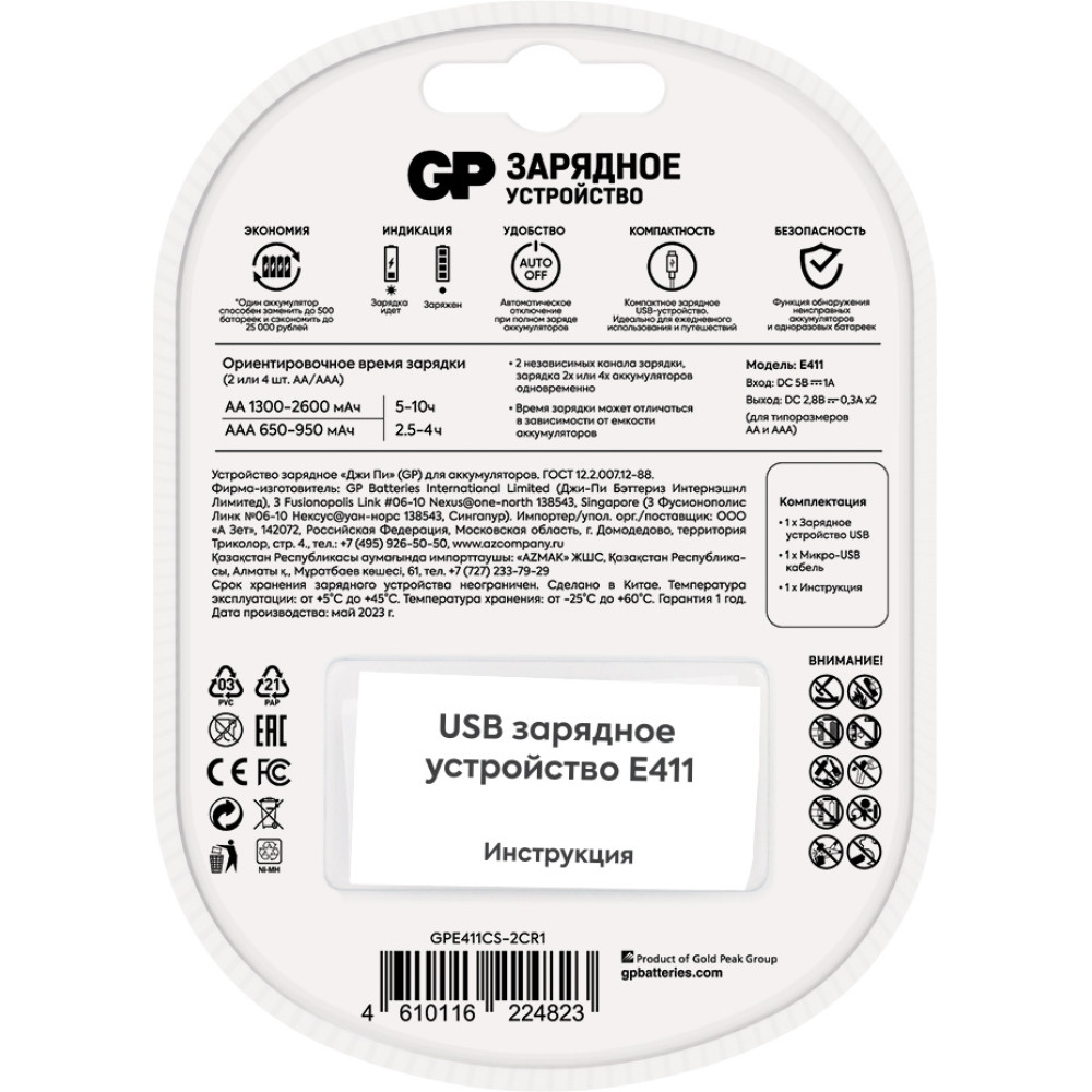 Зарядное устройство для аккумуляторов GP Е411CS-2CR1 имеет удобный компактный размер и позволяет носить зарядное устройство ежедневно с собой, брать в путешествия и командировки. Устройство оснащено разъёмом MicroUSB. Наличие в комплекте кабеля MicroUSB/USB позволяет универсально заряжать устройство от сети через компьютер, в машине и т.п.