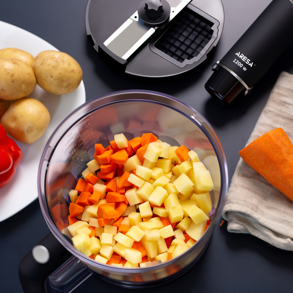 Кухонный комбайн ARESA AR-1705 справится с мгновенной шинковкой и нарезкой различных продуктов для последующего кулинарного процесса. Благодаря мощному медному мотору и специально разработанному редуктору, кухонный комбайн проработает гораздо дольше. Прибор имеет функцию плавной регулировки скорости, а также удобную систему защитной блокировки. Все терки представляют из себя двусторонние металлические диски, изготовленные из высокопрочной нержавеющей стали.