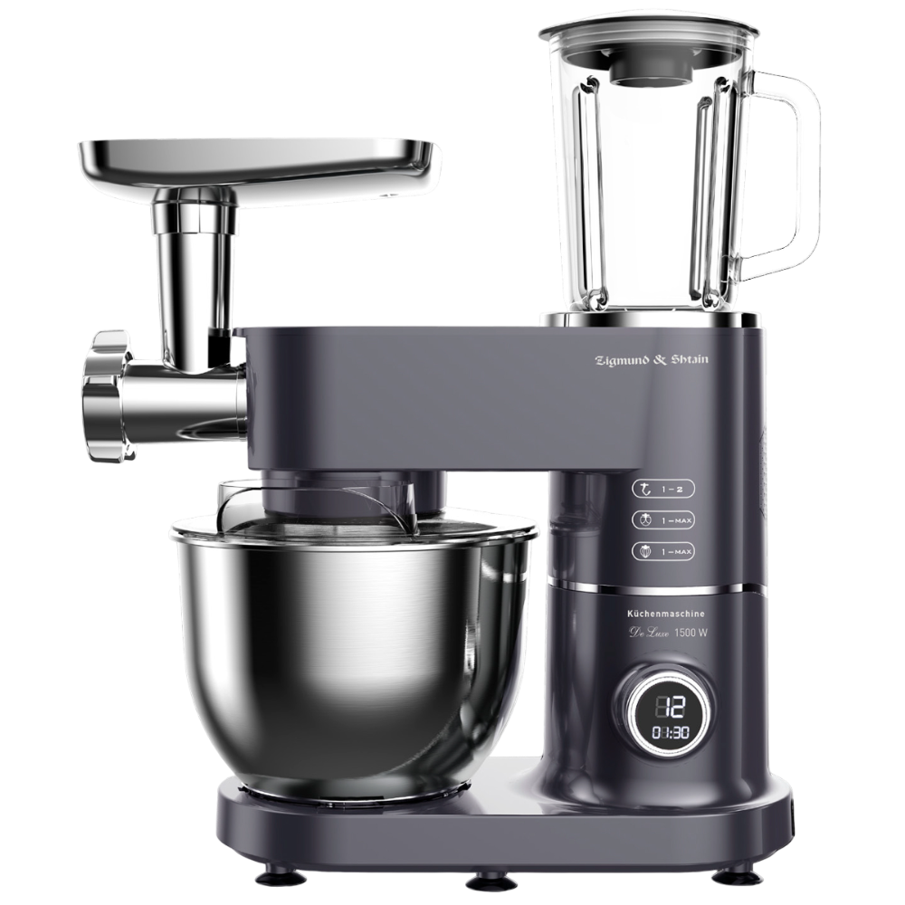 Кухонный комбайн Zigmund&Shtain ZKM-994 представляет собой планетарный миксер с 3-мя съемными насадками для замешивания теста, взбивания крема и жидких смесей, а также для смешивания ингредиентов. Кроме того, в конструкции предусмотрена возможность подключения стационарного блендера и мясорубки, что значительно увеличивает функциональность прибора и при компактных размерах делает его универсальным и незаменимым помощником на кухне. Планетарная система смешивания, воплощенная в миксере кухонной машины De Luxe ZKM-994, предполагает не только вращение насадок вокруг своей оси, но и дополнительные движения внутри чаши по «планетарной» траектории. Насадки быстро и плавно скользят по всему периметру чаши, полностью собирая со дна и стенок все ингредиенты, что обеспечивает их тщательное смешивание и качественное взбивание.