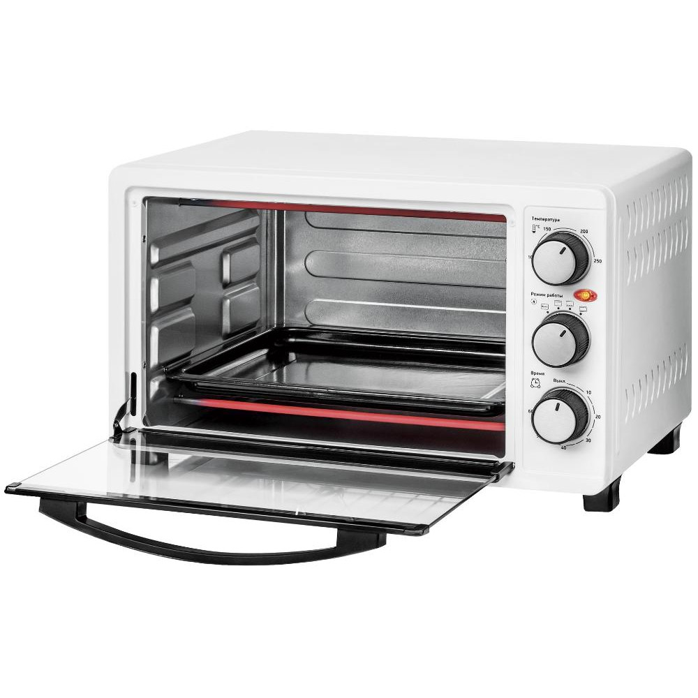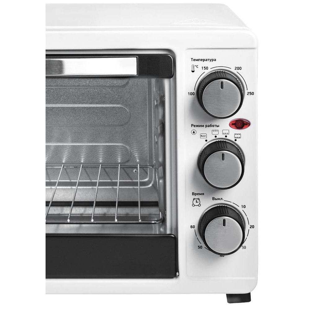 С помощью поворотных переключателей осуществляется управление моделью. Благодаря компактному размеру мини-печь можно поставить на небольшой стол. За счет высокой мощности устройство позволяет быстро приготовить необходимое блюдо.