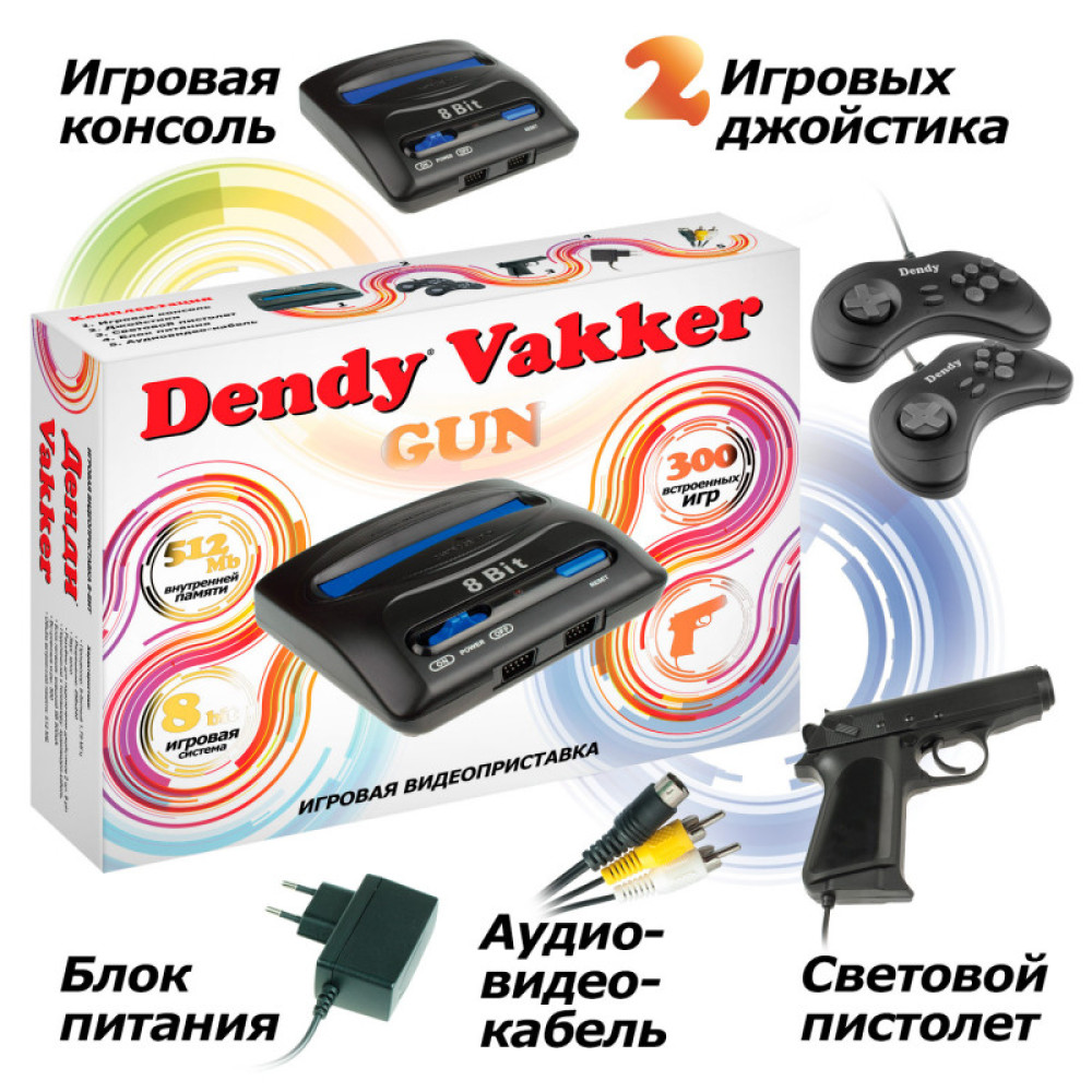 Видеоприставка Dendy Vakker принадлежит к разряду 8-битных игровых телевизионных приставок, от классических моделей осталась совместимость со стандартными картриджами 8-бит, но при этом имеется встроенная память с 300 играми самых разных жанров для больших и начинающих игроков.