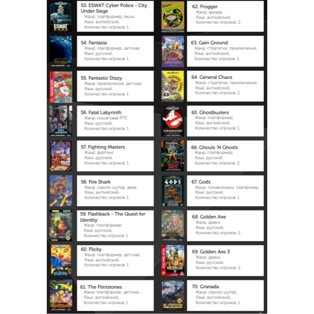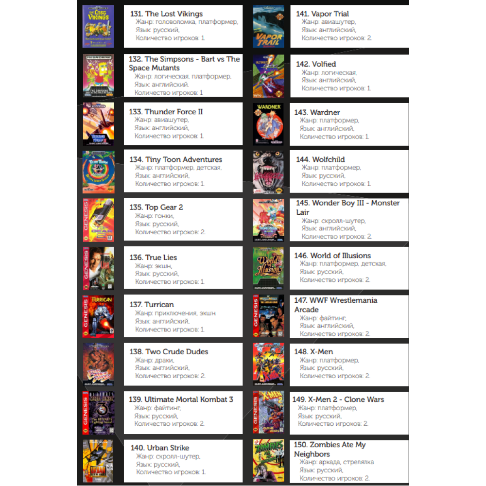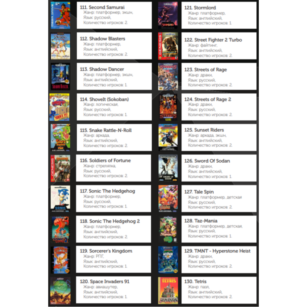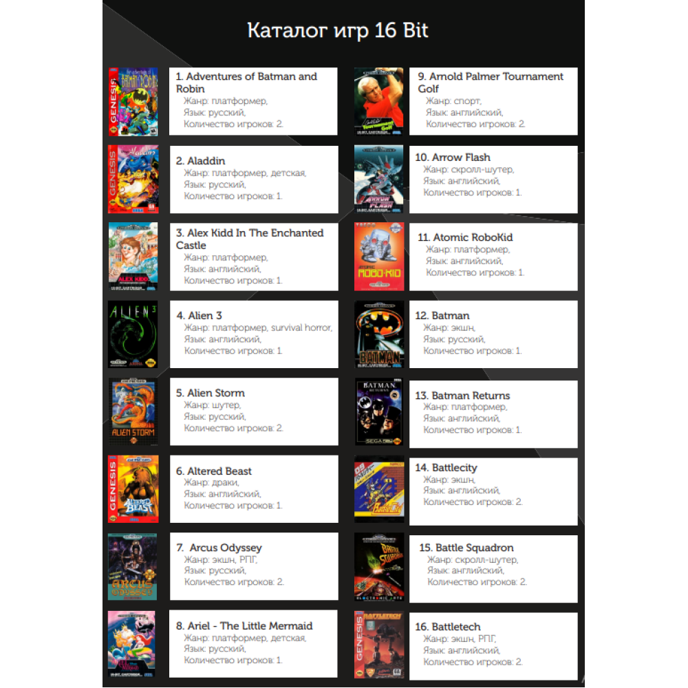 В приставку встроены 450 игр как для 16-битной приставки от Sega, так и от 8-битной приставки Famicom: 150 игр 16 bit и 300 игр 8 Bit.