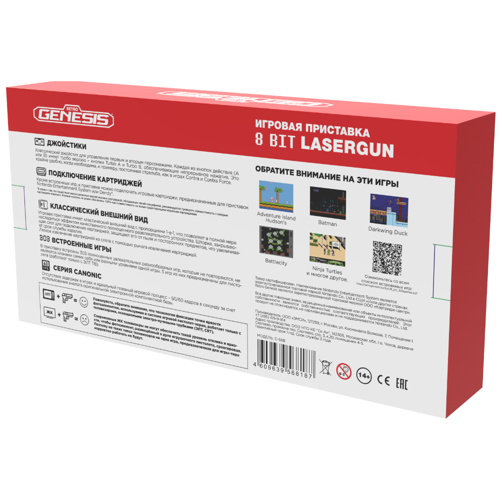 Retro Genesis Classic Gun Edition 8Bit имеет 303 предустановленных игр и поддержку воспроизведения игр с картриджей. С боковых сторон корпуса предусмотрены отсеки для хранения игровых контроллеров.
