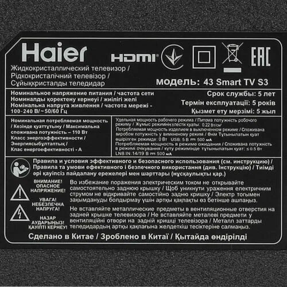 Технические характеристики Телевизор 43" HAIER S3, QLED. SMART TV
