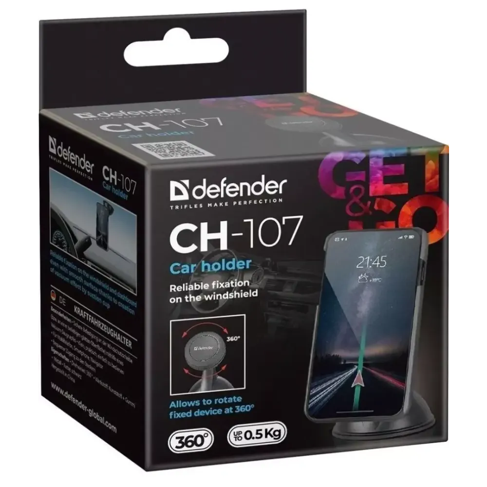 Держатель автомобильный Defender CH-107 ‒ компактное приспособление, разработанное для фиксации смартфона, планшета или навигатора в салоне авто. Аксессуар крепится на приборную панель или лобовое стекло при помощи присоски. Благодаря созданию вакуума присоска надежно удерживает устройство на поверхности.