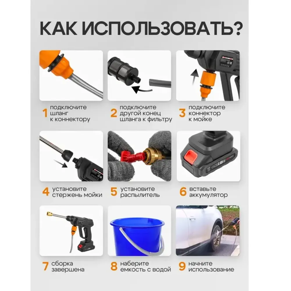 Комплектация | минимойка/аккумулятор/зарядное устройство/переходник-соединитель/шланг/фльтр для воды/спринкелер 0°/спринклер 45°/емкость для химии/удлинительная трубка/кейс |