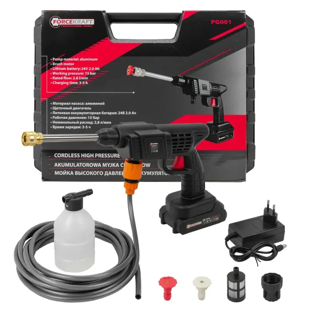 Минимойка Forcekraft FK-PG001(56936) идеально подойдет для мойки автомобиля, мотоцикла или велосипеда. Кроме того, пистолет аккумуляторный можно использовать не только для мытья, но и для полива садовых растений. Для этого следует установить на копьё рассеивающую насадку, которая обеспечит распыление воды широким факелом как из душа, и отрегулировать напор. Для мойки авто и твердых поверхностей подойдет спринклер высокого давления. А пеногенератор поможет быстро нанести моющее средство на любой сильно загрязнённый предмет или поверхность.