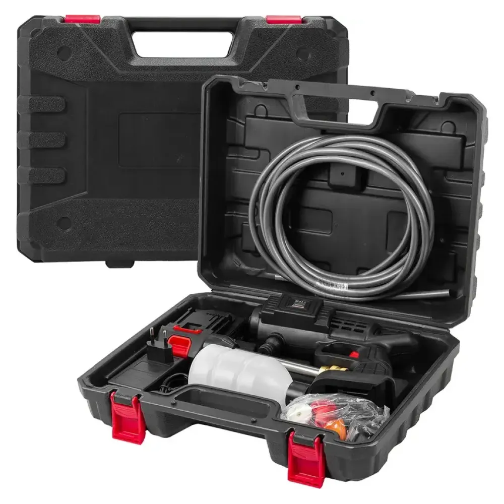 Корпус мойки высокого давления выполнен из прочного пластикового материала, который обеспечивает стойкость к механическим воздействиям и защиту от возможного удара. Весь набор поставляется в надежном пластиковом кейсе где у каждого инструмента и аксессуара есть свое место.