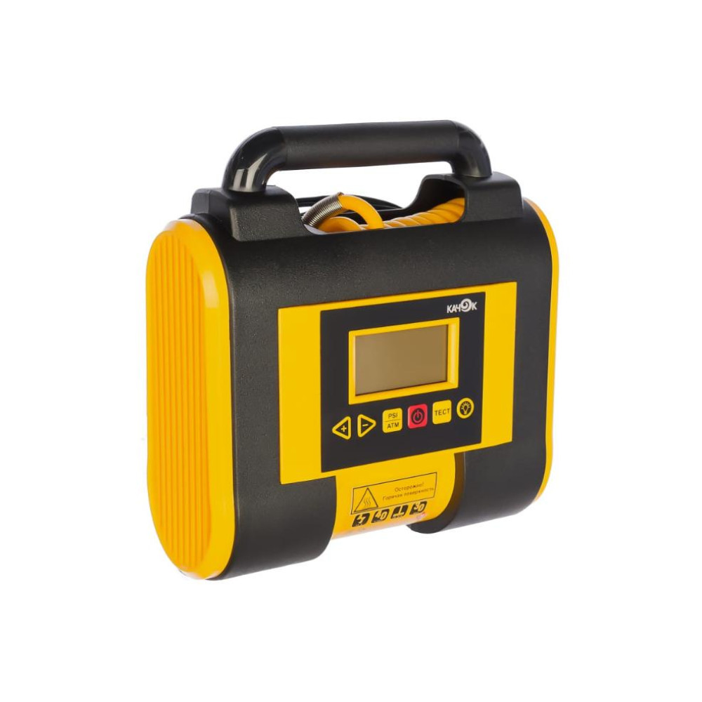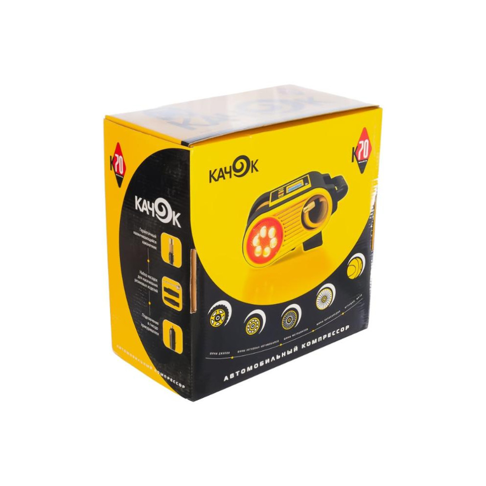 Компактный и удобный в использовании автомобильный компрессор модели КАЧОК K70 создан для оперативной и быстрой подкачки шин вашего автомобиля. Не всегда есть возможность и желание ехать до ближайшего шиномонтажа ради минутной проверки давления в колесах – в таких ситуациях компрессор станет отличным помощником. Он измерит показатель атмосфер в шинах, выведя на дисплей точные данные. Кроме того, эта модель способна проверить также и уровень заряда аккумулятора. Автомобильный компрессор модели КАЧОК K70 работает от обычного прикуривателя, поэтому подключить его не составит труда. Длинный пружинный провод позволит легко дотянуться до задних колес. В корпус прибора встроен удобный фонарик с двумя разными режимами работы на случай применения компрессора в условиях недостаточного освещения.