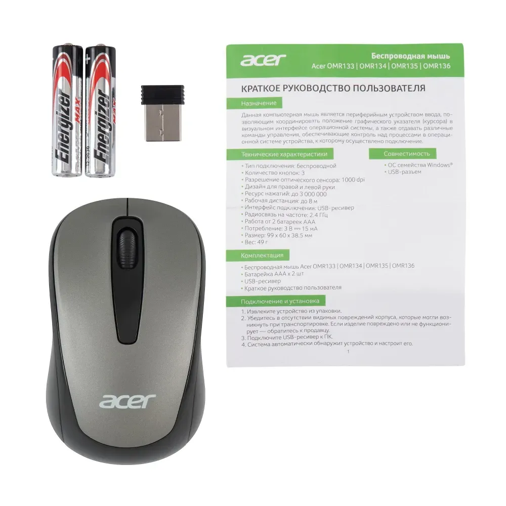 Технические характеристики Мышь Acer OMR134 серый