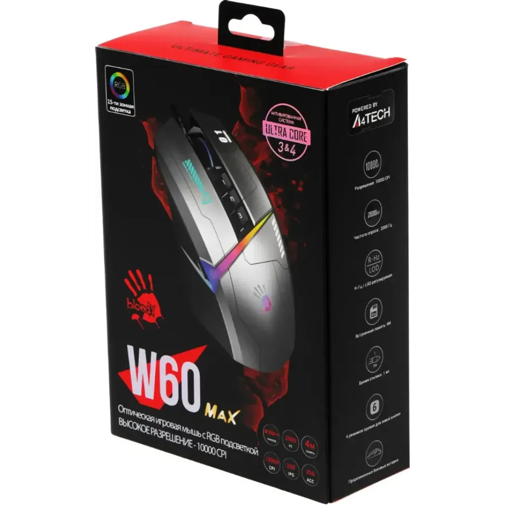 Игровая мышь A4Tech Bloody W60 Max Gun Grey/Black - оптическая модель с проводным подключением. Обладает высоким разрешением сенсора (10000 dpi) и возможностью изменения данного параметра с учетом конкретных задач. Устройство обеспечивает полный контроль и максимально быструю реакцию, что особенно важно в шутерах, когда нужно быть на шаг впереди противника. Манипулятор имеет 10 кнопок (из них 8 программируемые), среди которых есть колесо прокрутки, обеспечивающее тактильный комфорт.
