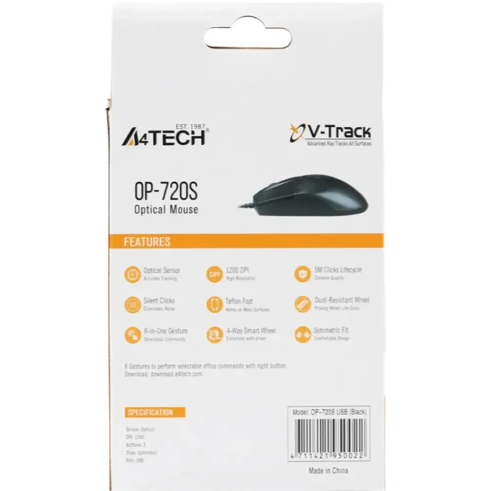 Конструкцией мыши проводной A4Tech OP-720S предусмотрено 3 кнопки, не издающих характерного щелчка в процессе нажатия. Колесико прокрутки служит для удобной навигации по Интернету и просмотра файлов. Матовое покрытие пластикового корпуса отталкивает загрязнения. Тщательно продуманная форма способствует комфортному захвату правой и левой ладонями.