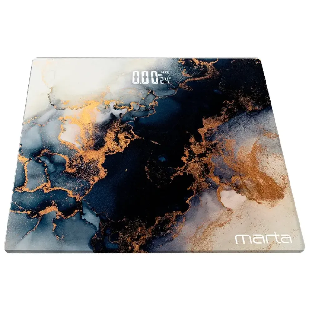 Напольные весы Marta MT-SC3600 «черное золото» — электронное устройство, оснащенное четырьмя датчиками. Модель выполняет взвешивание с погрешность до 50 г. Максимальная нагрузка — 180 кг. Результаты измерений, сообщения о перегрузке и заряде батарей можно увидеть на дисплее. Материалы, из которых изготовлены корпус и платформа — пластик и закаленное стекло. Специальные вставки препятствуют скольжению. Прибор включается и выключается автоматически.